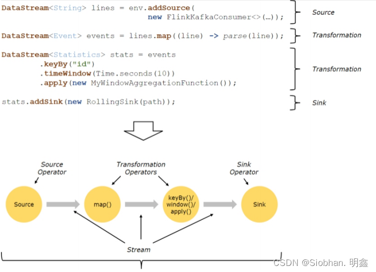 Flink程序的基本构建块是流和转换(请注意,Flink的DataSet API中使用的DataSet也是内部流 )。