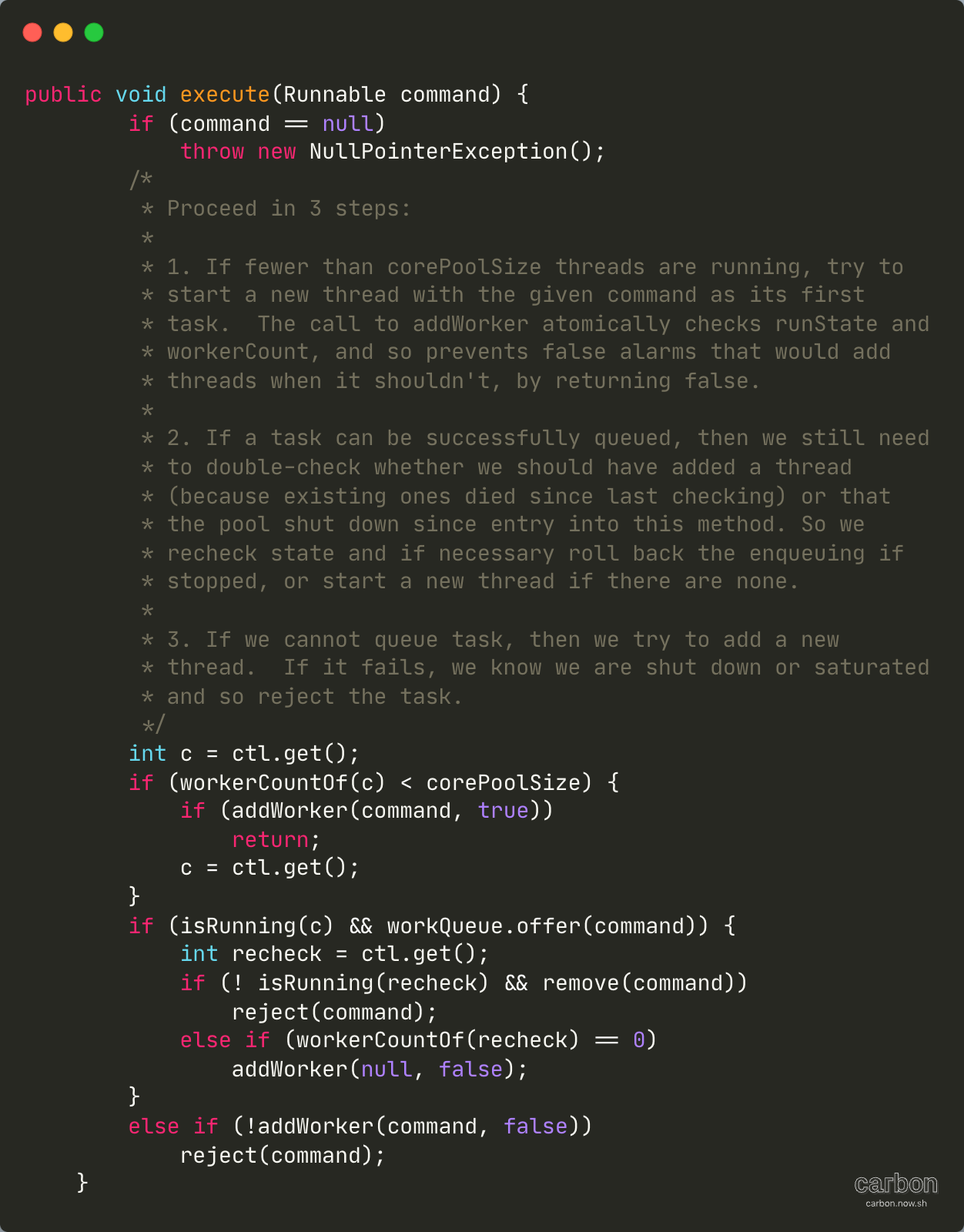 上面这段代码是Java线程池中 execute方法的实现部分。