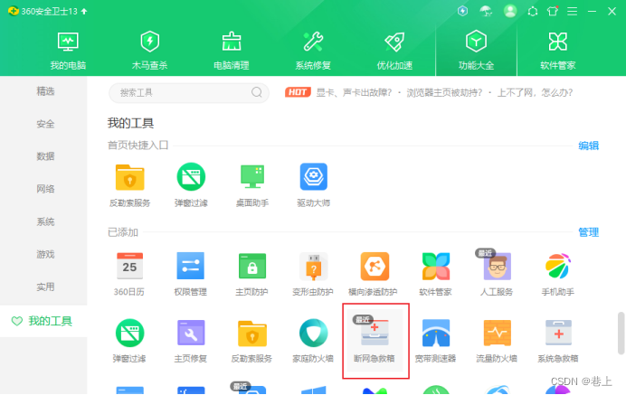 选择功能大全—>断网急救箱—>全面诊断---->后修复