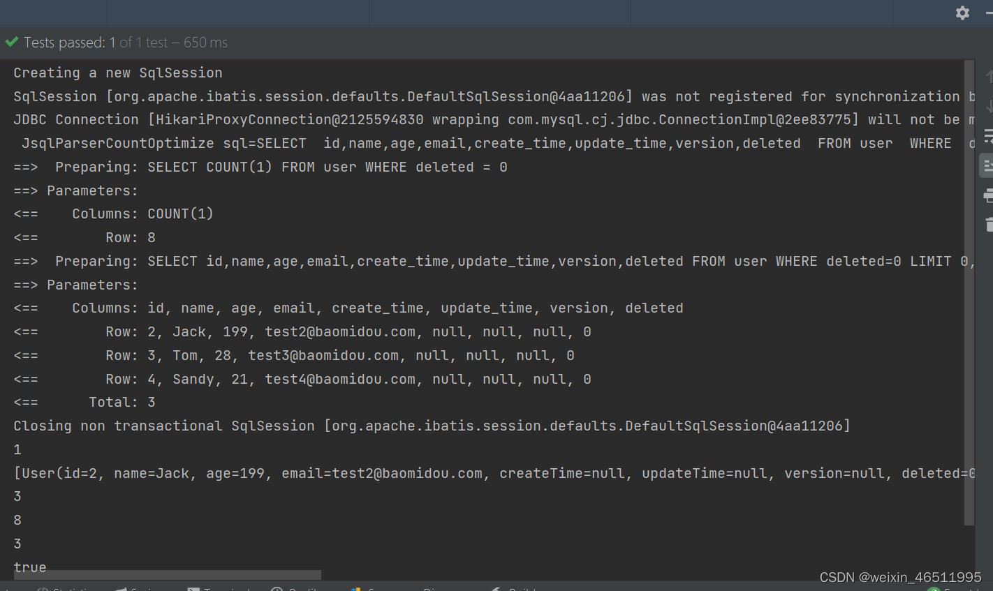 SELECT id,name,age,email,create_time,update_time,version,deleted FROM user WHERE deleted=0 LIMIT 0,3