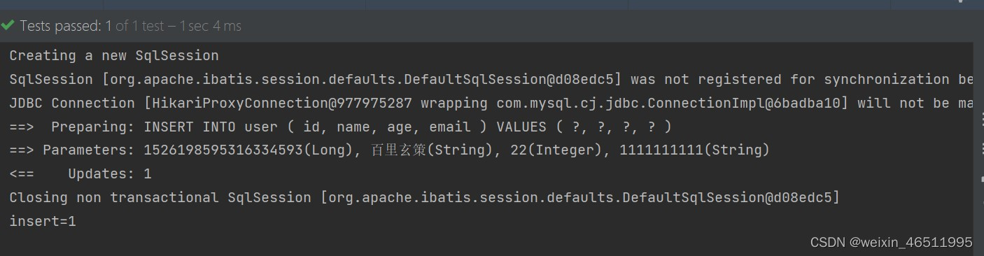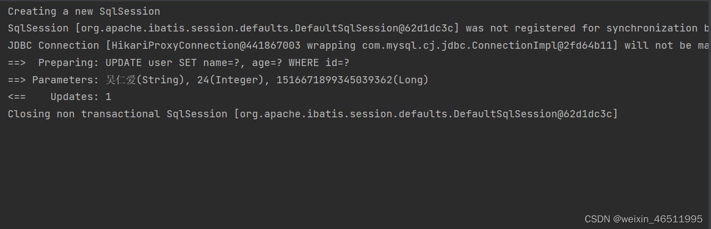注意:update时生成的sql自动是动态sql:UPDATE user SET age=? WHERE id=?