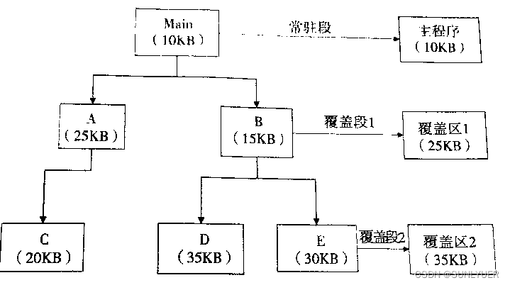 思想:由于程序运行时并非任何时候都要访问程序及数据的各个部分(尤其是大程序),因此可把用户空间分成一个固定区和若干覆盖区.将经常活跃的部分放在生固定区,其余部分按调用关系分段。首先将那些即将要访间的段放入覆盖区,其他段放在外存中,在需要调用前,系统再将其调入覆盖区,替换覆盖区中原有的段。