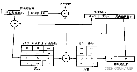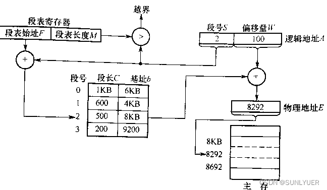 1)由逻辑地址中的段号S与段表长度M比较,如果S小于M,就继续否则发生越界中断。