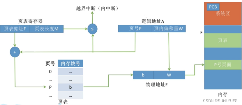 3.查询页表,找到页号对应的页表项,确定内存块号;P对应的页表项地址=页表起始地址F+页号P*页表项长度,得到b(每个页表项的长度是相等的,页号是“隐含”的)