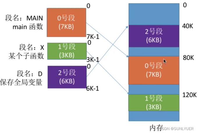 进程的地址空间按照自身的逻辑关系划分为若干个段,每个段从0开始编址(段名可供程序员编程);内存以段为单位进行分配,每个段在内存中占用连续的空间,但可以不相邻