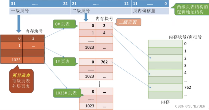 解决:参考进程在内存中必须连续存储的问题,我们将地址空间分页,同样的思路也可用于解决上述问题,把必须连续存放的页表再分页;如上例中,页面大小4KB,每个页表项4B,每个页面可存放1K个页表项,因此每1K个连续的页表项为一组,每组刚好占一个内存块,再将各组离散地放到各个内存块中,为离散分配的页表再建立一张页表,称为页目录表,或称外层页表,即: