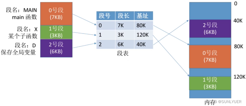 每个进程都有一张逻辑空间与内存空间映射的段表,每个段表项对应进程的一段,并记录了段的长度和段在内存中的起始位置