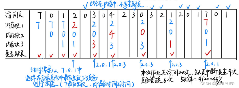 【eg】:假设系统为某进程分配了三个内存块,并考虑到有一下页面号引用串(会依次访问这些页面) :7,0, 1,2,0,3,0,4,2,3,0,3,2, 1,2,0,1, 7,0,1,计算使用OPT算法访问过程中的缺页次数和缺页率