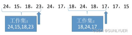 工作集是指某段时间内进程实际访问页面的集合(注意区分驻留集,驻留集一般不小于工作集)。工作集由时间和窗口大小来确定,假定系统设定的工作集窗口大小为4,则下图两个时刻的工作集有: