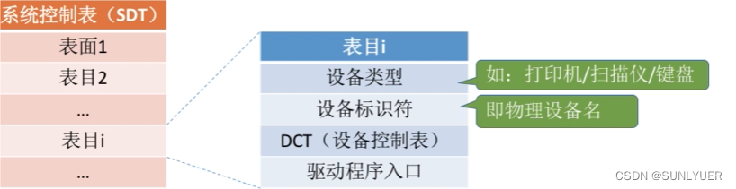 ④系统设备表SDT:记录了系统中全部设备的情况,每个表目对应一个设备