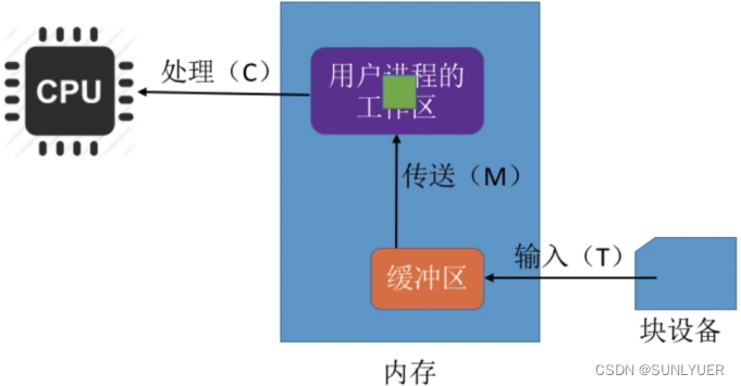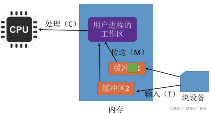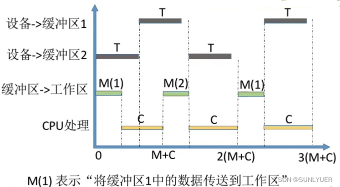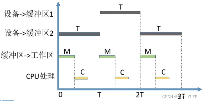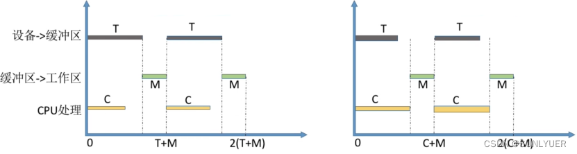 所以采用单缓冲策略,处理一块数据平均耗时Max(C, T)+M