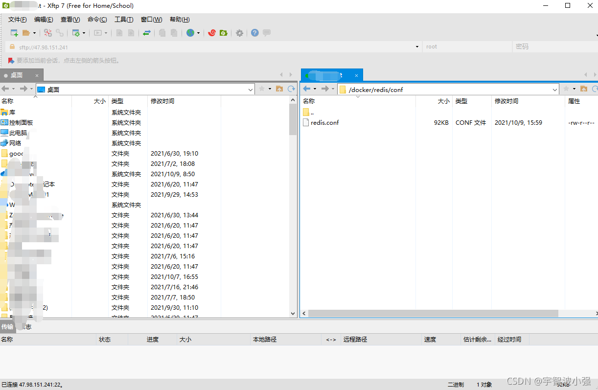 去redis官网下载相应版本的tar包,并复制其中的redis.conf(这里有个坑,redis的docker容器里面是不自带配置文件的),通过Xftp或FileZilla上传到刚才新建的redis/conf中