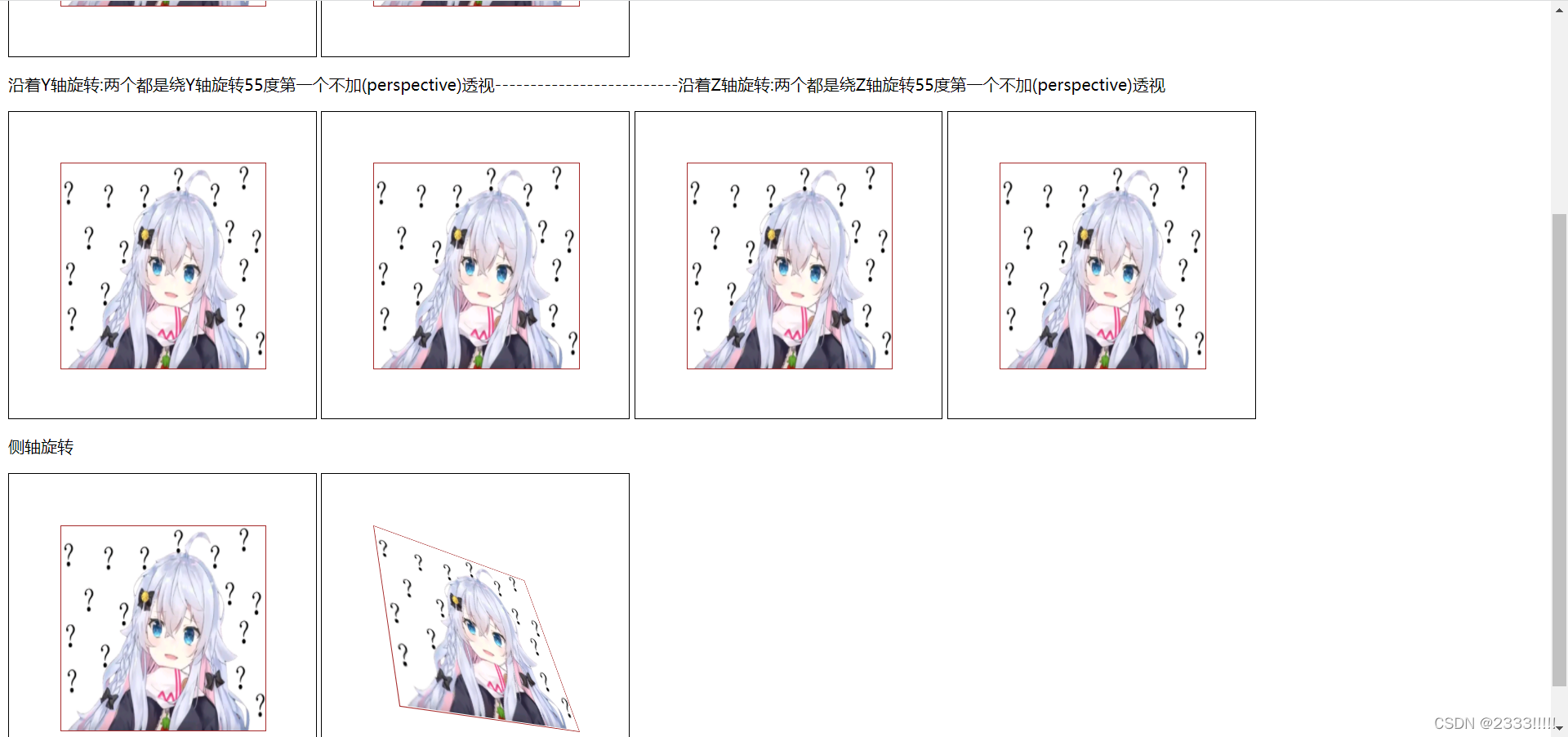 <p>沿着Y轴旋转:两个都是绕Y轴旋转55度第一个不加(perspective)透视--------------------------沿着Z轴旋转:两个都是绕Z轴旋转55度第一个不加(perspective)透视</p>