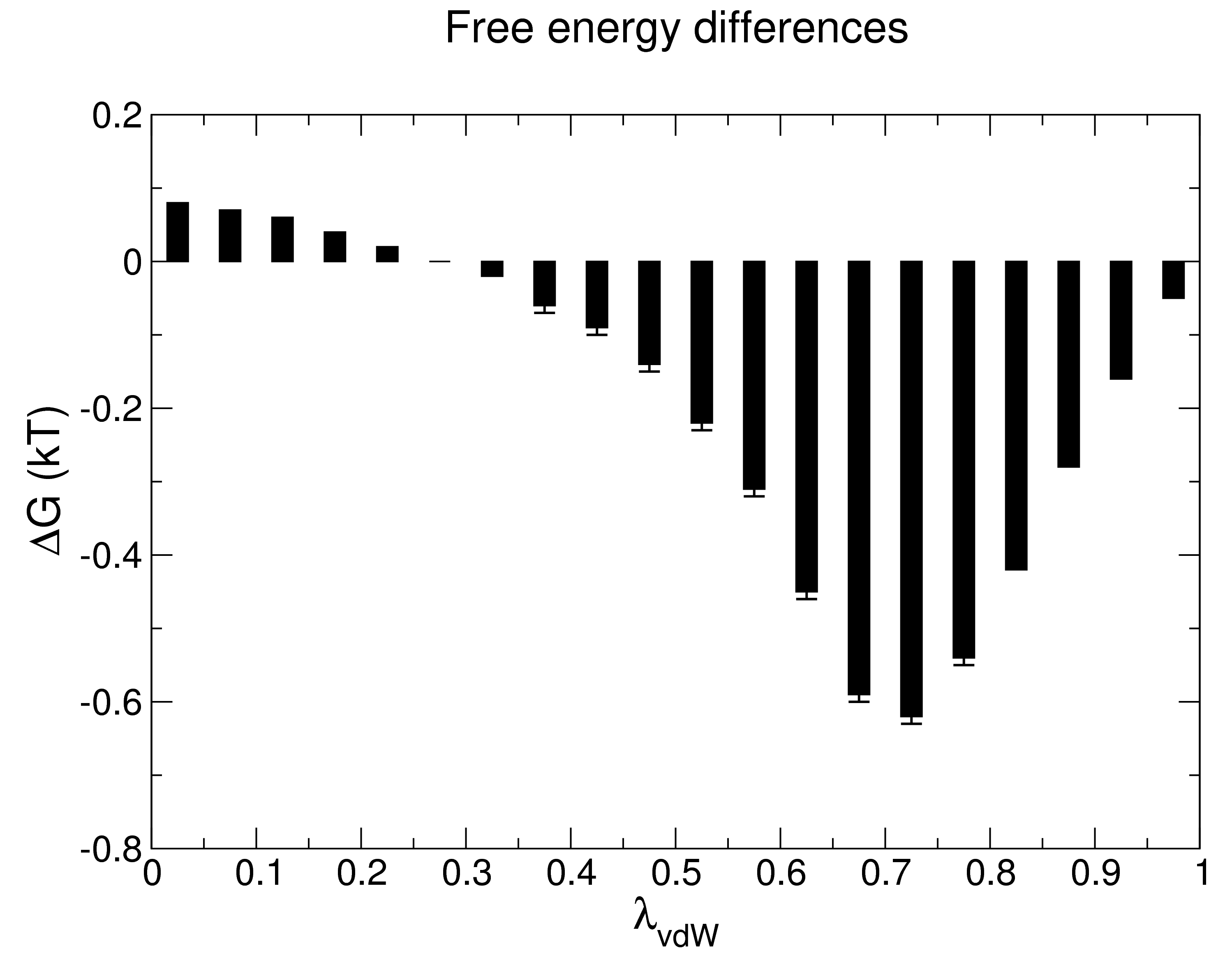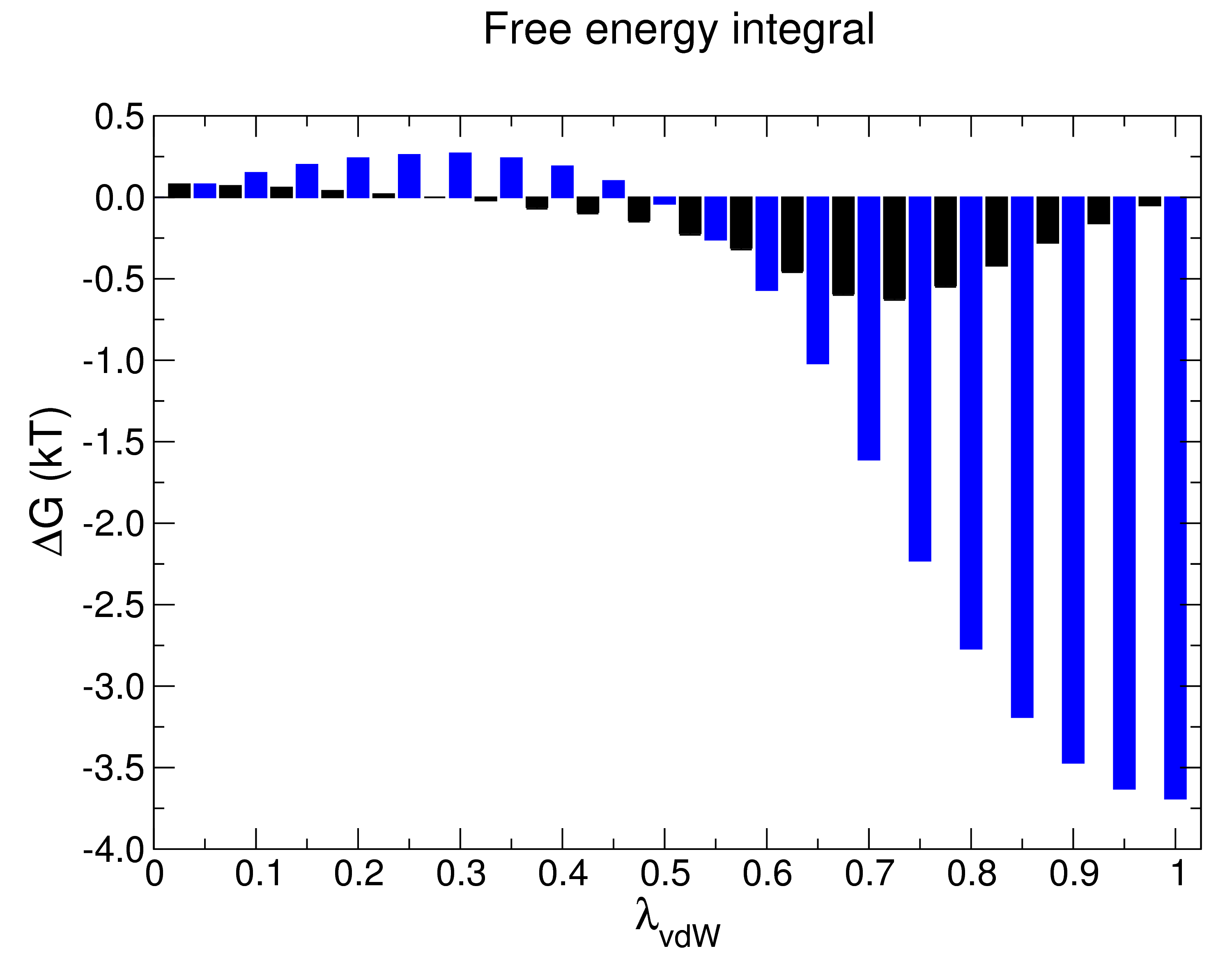 | The bar module of GROMACS makes the calculation of ΔGAB very simple. Simply collect all of the md*.xvg files that were produced by mdrun (one for each value of λ) in the working directory and run gmx bar: gmx bar -f md*.xvg -o -oi