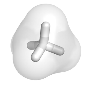 | Download the coordinate file and topology for this system. These files were provided as part of David Mobley's tutorial for this system (which is no longer online), and are the original files (modified slightly for compatibility with recent GROMACS versions) used by Michael Shirts in the paper referenced on the previous page. The system contains a single molecule of methane (called "ALAB" in the coordinate file, for the β-carbon of alanine) in a box of 596 TIP3P water molecules. Looking into the topology, we find: ; Topology for methane in TIP3P