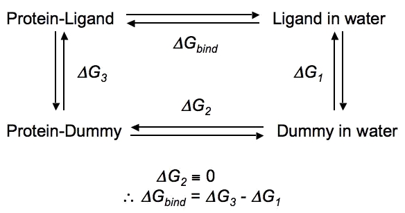 | One common application of calculating free energies is to determine the of ΔG of binding between a ligand and a receptor (e.g., a protein), you would need to perform (de)coupling of the ligand in complex with the receptor and in bulk solution, since ΔG is (in this case) the sum of the free energy change of complexation of the ligand and receptor (i.e. the introduction of the ligand into the binding site) and the free energy of desolvating the ligand (i.e. removing it from solution): ΔGbind = ΔGcomplexation + ΔGdesolvation ΔGsolvation = -ΔGdesolvation ∴ ΔGbind = ΔGcomplexation - ΔGsolvation ΔG of binding will be the difference between these two states, and can be calculated through the use of the following (somewhat simplified) thermodynamic cycle, wherein ΔG1 is ΔGsolvation and ΔG3 is ΔGcomplexation in the equations above.