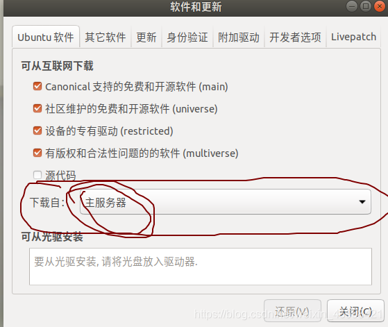打开系统设置,软件与更新这里,Download from(下载自)一定是Main server(主服务器)。