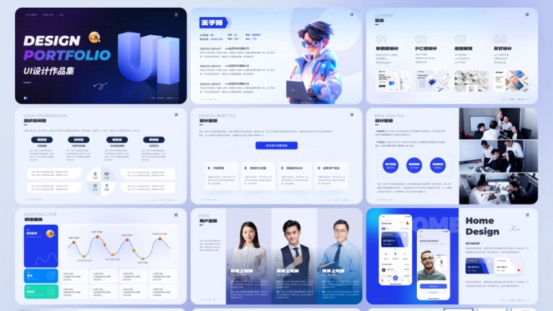 UI设计/交互设计/视觉设计项目汇报/作品集Figma/PPT模板 组织你的作品集:决定你的作品集的格式和结构。如果您正在申请特定的工作或客户,请定制您的作品集以突出符合其需求的相关技能和经验。提供项目描述:对于您的投资组合中的每个项目,提供一个简短的描述,解释项目的目标、挑战和解决方案。展示您的流程:如果可能,包括对您的设计流程的见解,例如草图、线框图、情绪板和设计迭代。选择您的最佳作品:选择您最强大且最相关的设计项目,将其纳入您的作品集。通过遵循这些步骤并花心思和精力来策划你的作品集,你可以创建一个引人注目的展示你的设计技能并吸引潜在的客户或雇主。
