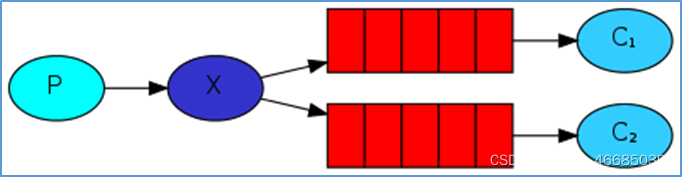 在Publish/Subscribe工作模式中,必须先配置一个fanout类型的交换器,不需要指定对应的路由键(Routing key),同时会将消息路由到每一个消息队列上,然后每个消息队列都可以对相同的消息进行接收存储,进而由各自消息队列关联的消费者进行消费。