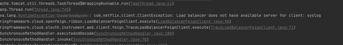 然后我这里还遇到一个问题,feign一直走熔断,我打印了下runtimeException。