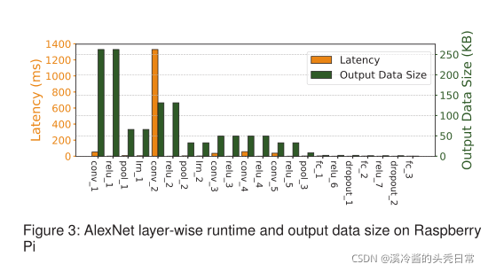 DNN划分:为了更好的理解DNN推理性能上的瓶颈,图3我们细化了层延迟(在树莓派上)和每层的中间数据输出大小。如图3我们可以看出每层的延迟和输出数据大小都有很大的差异性,这意味着延迟越大的层输出数据的大小不一定大。基于这个观察结果,一种直观的思想就是DNN划分,将DNN分成两部分,将计算密集的那部分以低的传输开销卸载到服务器,这样可以减少总体的端到端执行延迟。作为说明,我们选用图3中的第二个本地响应归一化层(即Irn_2)作为划分点,并将该点和之前的层卸载到服务器端而其余部分留在设备上。通过在设备和边缘之间的模型划分,综合利用邻近的混合计算资源,实现低时延DNN推断。
