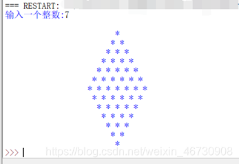 思路:首先使用一个for循环输出菱形的上半部分,然后再使用一个for循环输出菱形的下半部分;其中center()是字符串排版方法,参数n**7表示排版后字符串长度。