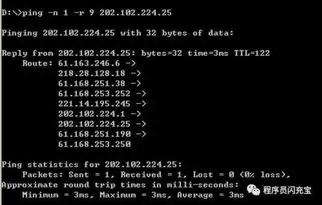 ping -n 1 -r 9 202.102.224.25 (发送一个数据包,最多记录9个路由)
