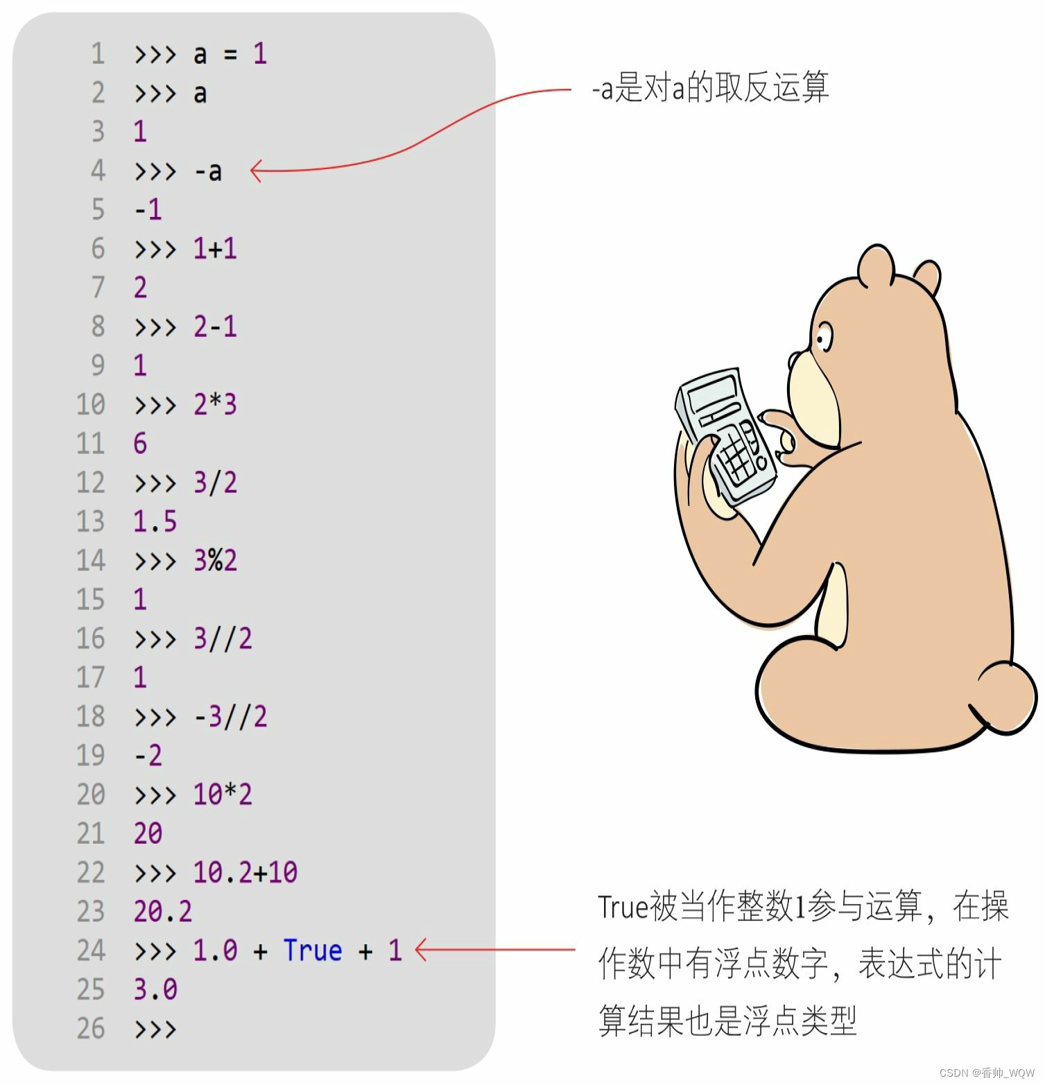 算术运算符用于组织整数类型和浮点类型的数据,有一元运算符和二元运算符之分。