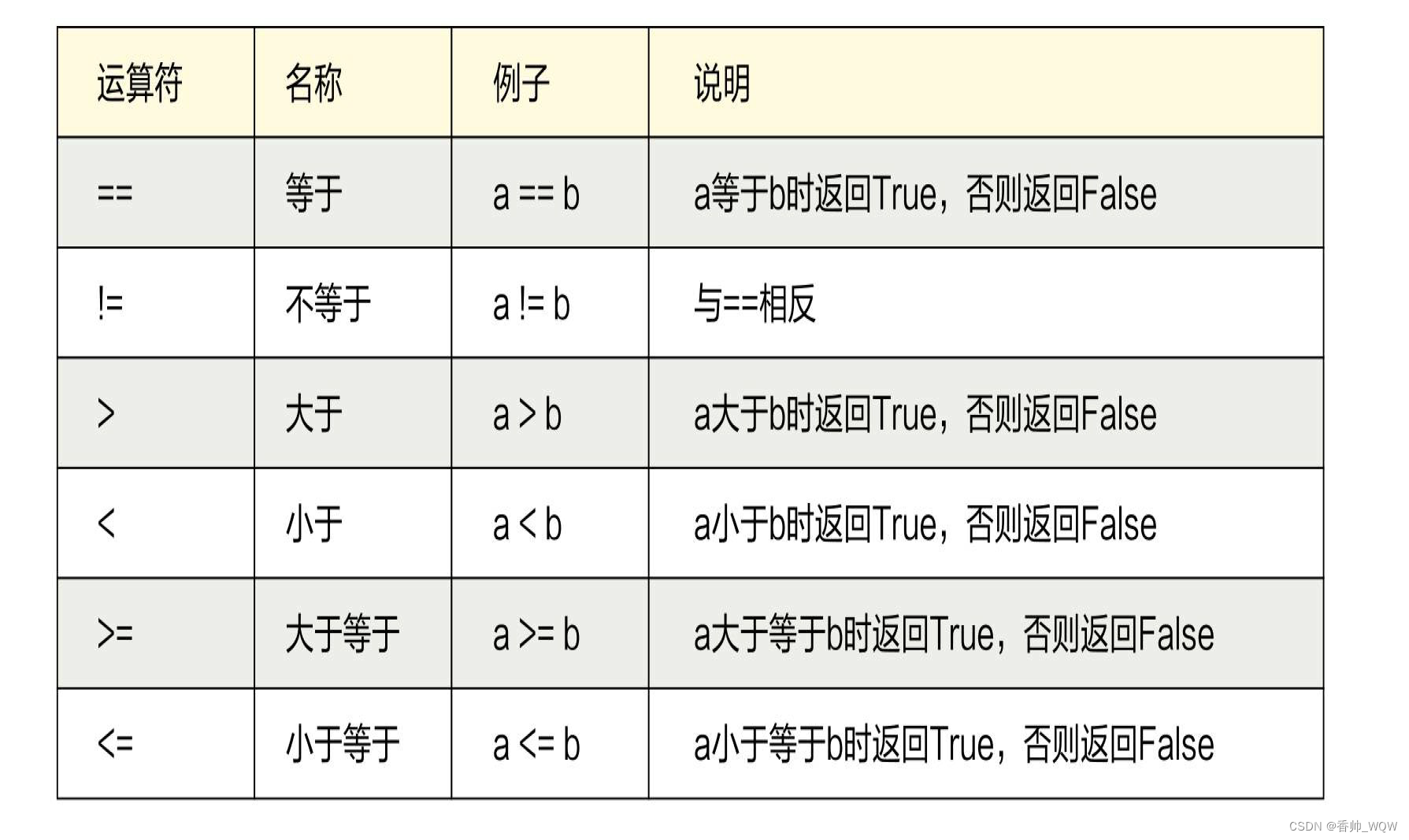 比较运算符用于比较两个表达式的大小,其结果是布尔类型的数据,即True或False。