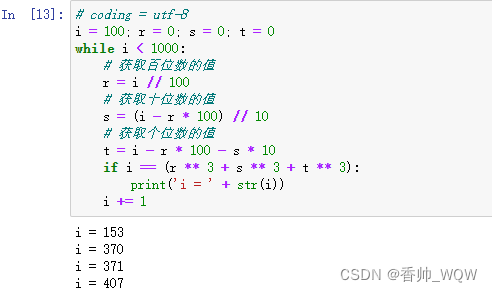 下面编写代码,通过while循环计算出水仙花数。提示:水仙花数是一个三位数,三位数各位的立方之和等于三位数本身。