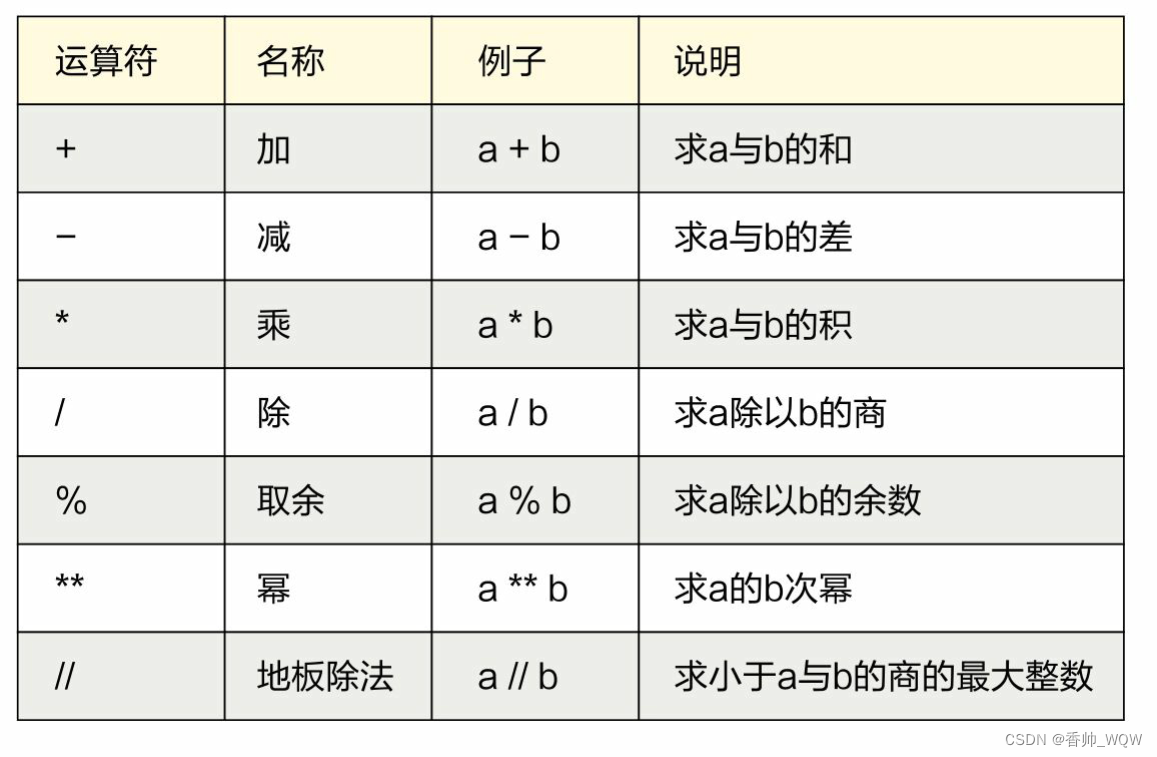 二元算术运算符如右表所示。