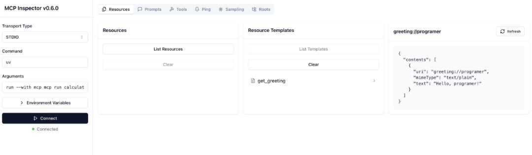 连接后,我们就可以测试示例中的加法工具和查看资源了。(讲道理,debug工具对中文展示并不友好)