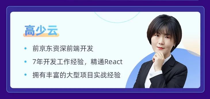本次课程的主讲老师是高少云老师,高老师是前京东资深前端开发工程师,精通React,拥有7年互联网大厂一线开发经验,深入业务。跟着她学习,你将不仅得到理论,还能学到这些原理在业务中的应用。