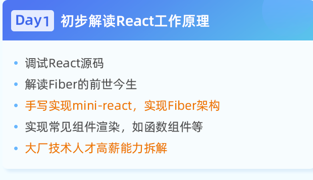 第一天从调试React源码开始,解读fiber的前世今生,带大家手写一个mini-react ,并实现fiber架构,解决面试中常见的相关问题: