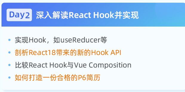 带大家实现hook,并讲解最新发布React18新的Hook API。这一天不仅讲技术,还会以点评学员简历的方式,解读如何打造一份合格的P6级别的简历: