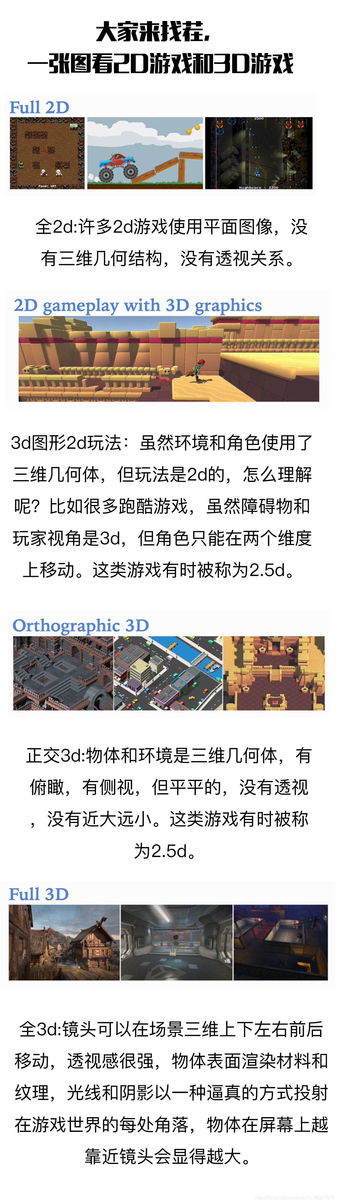 物体和环境是三维几何体,有俯瞰,有侧视,但平平的,没有透视,没有近大远小。这类游戏有时被称为2.5d。