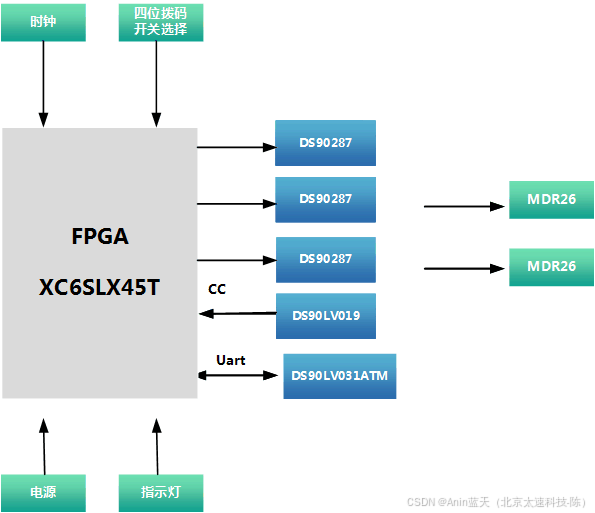 板卡采用单FPGA的结构,FPGA采用XILINX的SPARTAN6系列的XC6SLX45T-1FF484I,用来实现Full 模式下的一路Camera Link转光纤功能输出。