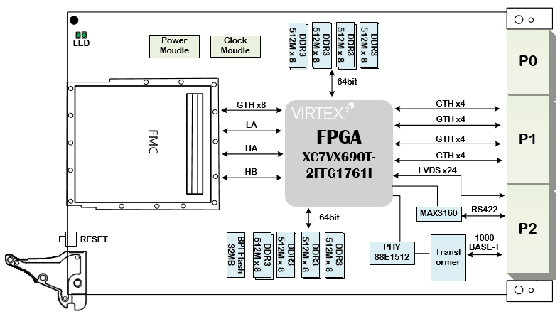 本板卡系我司自主研发的基于3U VPX导冷架构的信号处理板,适用于高速图像处理等。芯片采用工业级设计。该处理板包含1片Xilinx公司的Virtex7系列FPGA-XC7V690T-2FFG1761I。板载两组64位宽DDR3,每组容量4GB,一个HPC FMC接口。VPX接口连接4组x4 GTH,24组LVDS,一路RS422,一路1000Base-T。板卡的电气与机械设计依据VPX标准(VITA 46.0),支持导冷,能够满足用户在特殊环境下的使用需求。