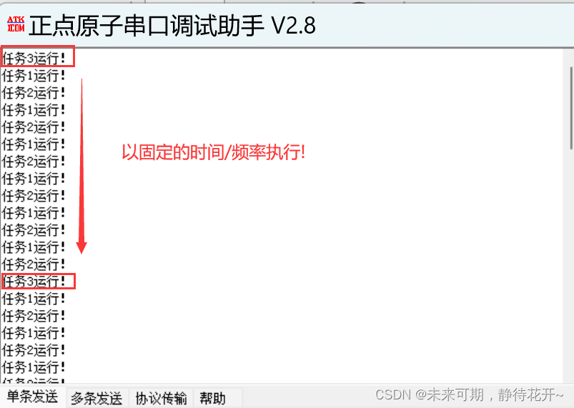 定义三个任务,任务1和任务2使用vTaskDelay()函数。任务3使用vTaskDelayUntil()函数。 任务3将以固定的频率进行执行。