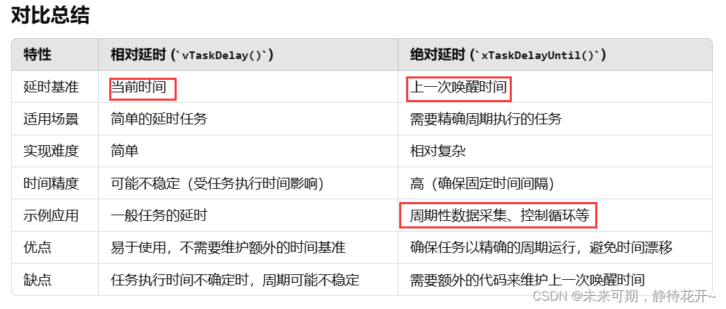 xTaskDelayUntil() 是 FreeRTOS 中用于创建相对精确的周期性任务的函数。它可以确保任务以固定的时间间隔运行,而不受其它任务的影响。与 vTaskDelay() 不同,xTaskDelayUntil() 通过一个时间基准点来确保周期的准确性。绝对延时:指将整个任务的运行周期看成一个整体,适用于需要按照一定频率运行的任务。