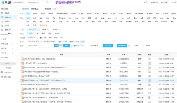 最后还有一些企鹅号、大鱼号、豆瓣之类的,这里就不一一介绍了,因为我个人比较推荐的就是以上这5个平台。其实平台选好以后,大家还需要注意,一定要学会利用工具来进行创作,尤其是新手。比如用易撰。易撰有爆文素材库、视频库、文章原创度检测、热点追踪、标题生成等功能,能很大程度帮到我们。