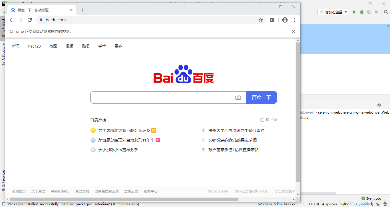 安装好之后在pycharm中运行如下python代码来打开百度网页。