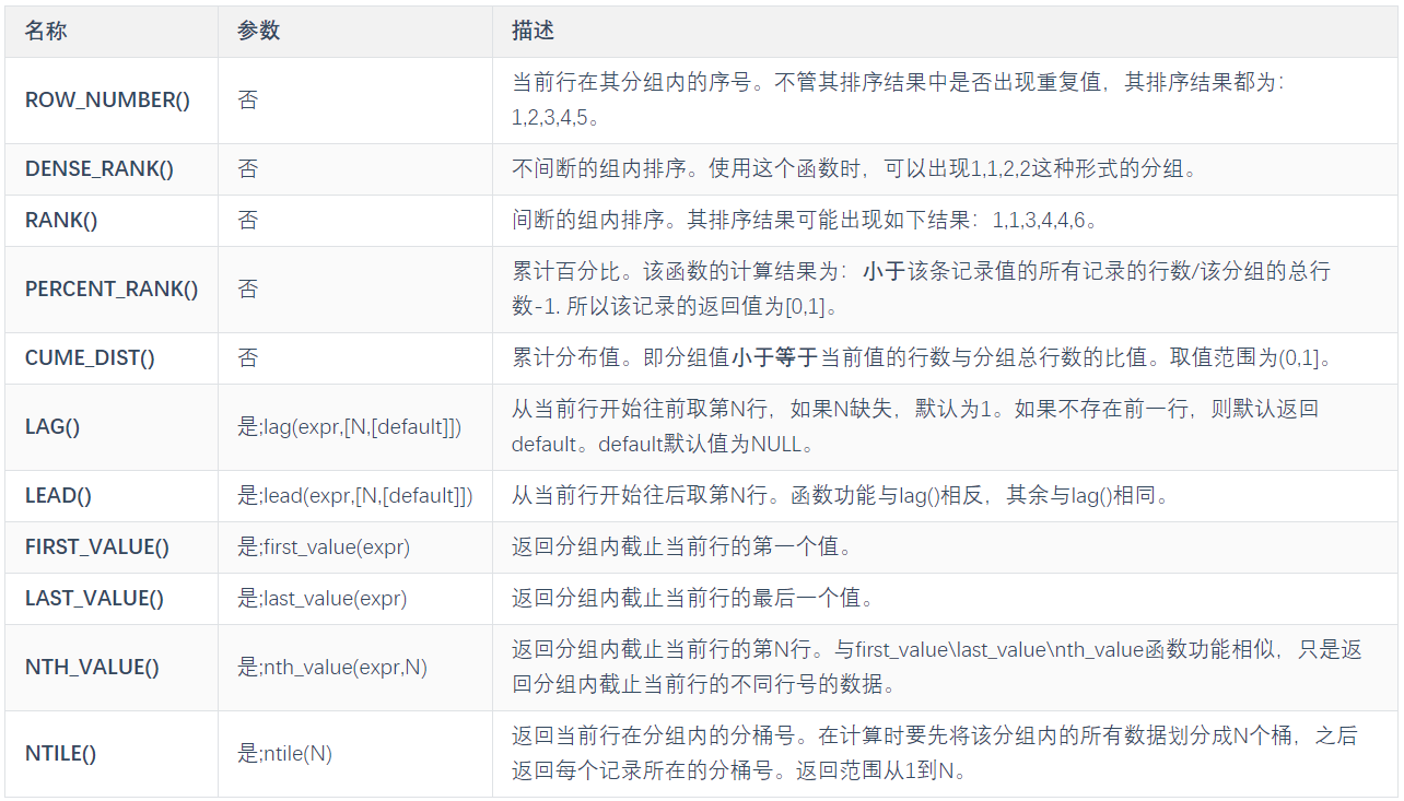 (注意:MySQL从8.0开始支持窗口函数)