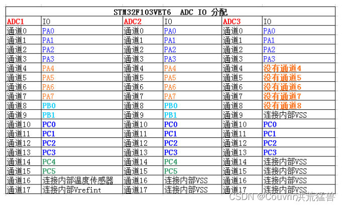 ADC,模数转换。在STM32F103VET6中,有3个ADC,精度为12位,每个ADC最多有16个通道。其中ADC1和ADC2都有16个外部通道,ADC13根据CPU引脚的不同通道数也不同,一般都有8个外部通道。
