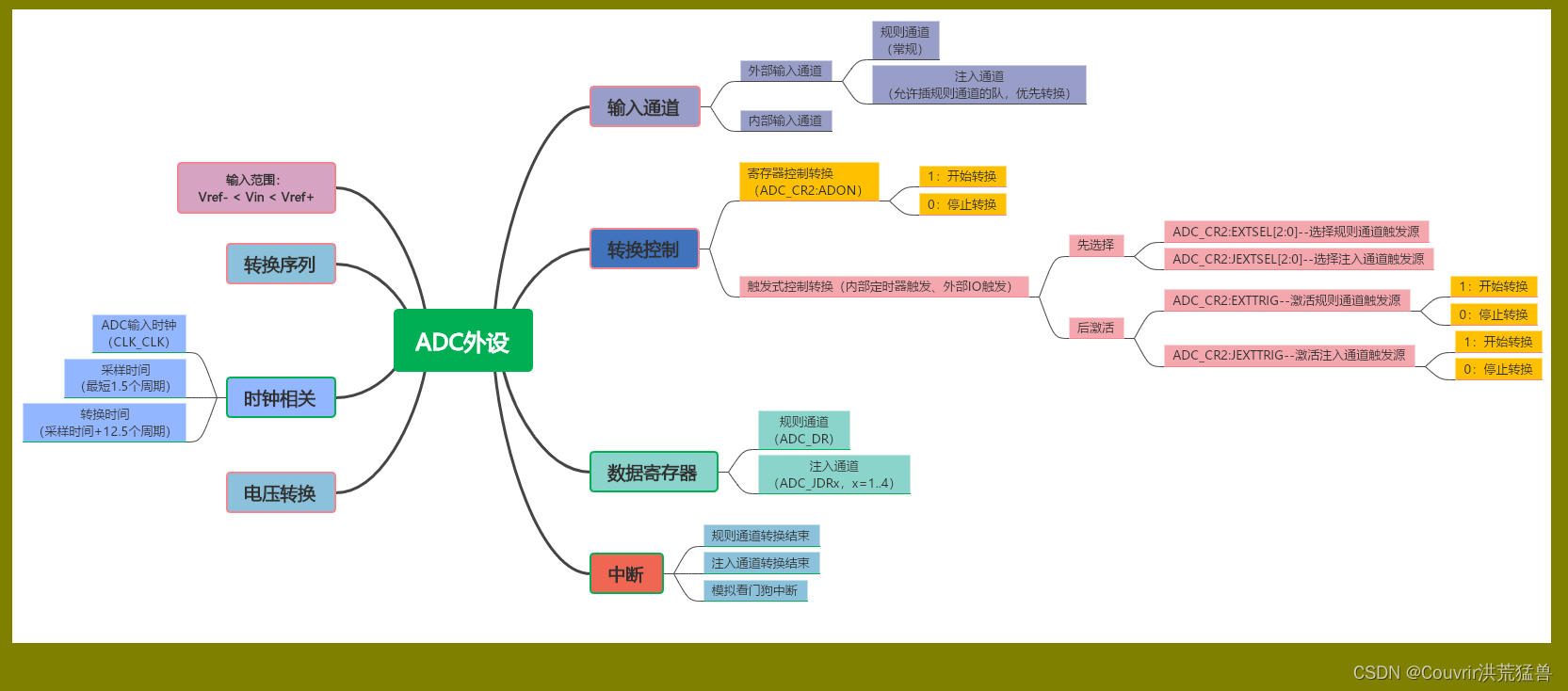 寄存器控制转换:ADC_CR2:ADON位控制(1开始转换,0停止转换)。