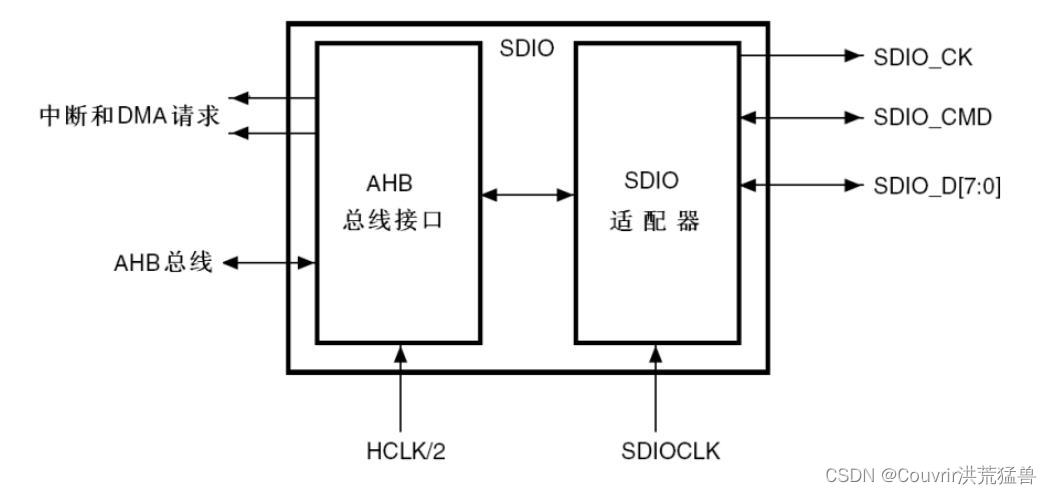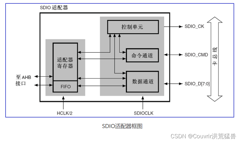 适配器寄存器和 FIFO 使用 AHB 总线一侧的时钟(HCLK/2),控制单元、命令通道和数据通道使用 SDIO 适配器一侧的时钟 (SDIOCLK)。