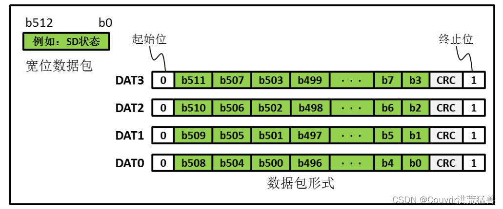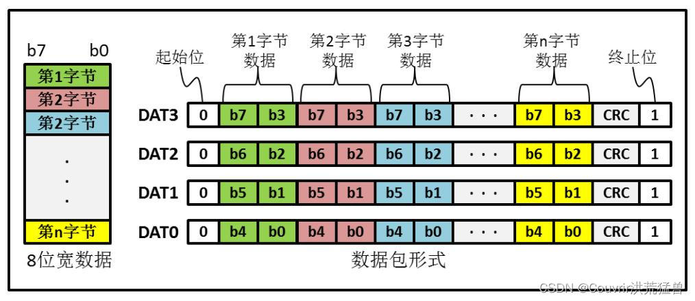 使用4根数据线传输时,每次传输4bit数据,每根数据线都必须有起始位、终止位、CRC位,CRC位每根数据线都要分别检查,并把检查结果汇总,然后在数据传输完成后通过D0线反馈给主机。