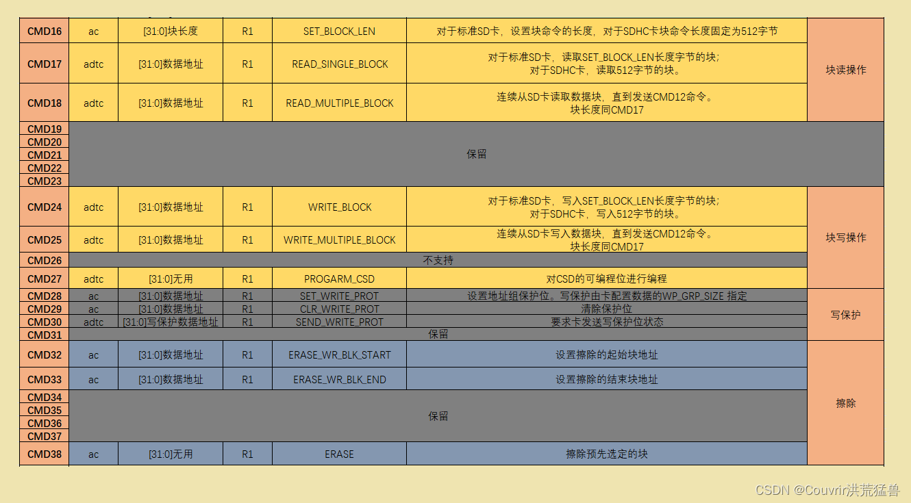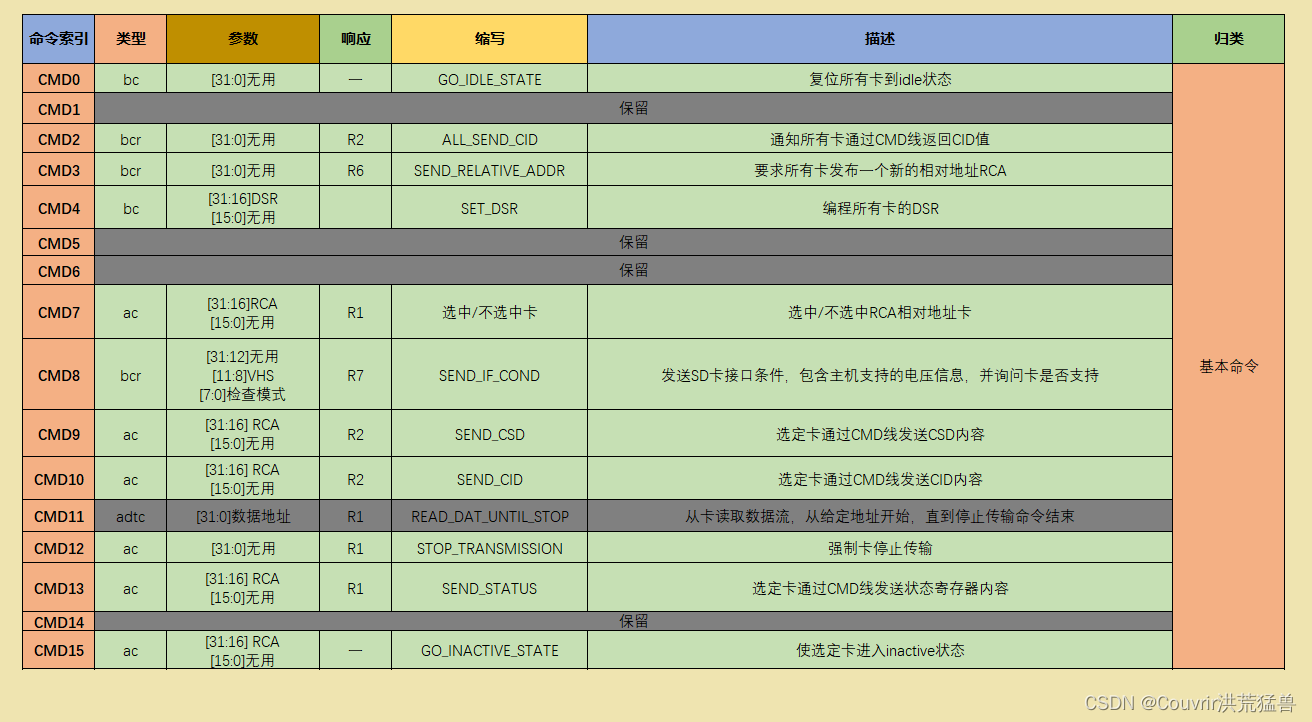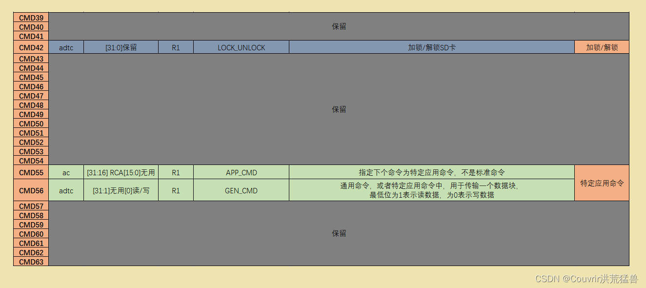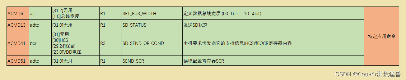 在标准中定义了两种类型的通用命令:特定应用命令 (ACMD) 和常规命令 (GEN_CMD)。