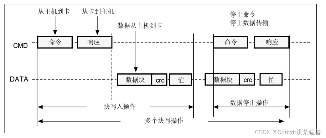 数据传输模式下的数据通信都是主机和目标卡之间通过寻址命令点对点进行的。 CMD12 可以中断正在进行的数据通信,让卡返回到传输状态。 CMD0 和 CMD15 会中止任何数据编程操作,返回卡识别模式,这可能导致卡数据被损坏。