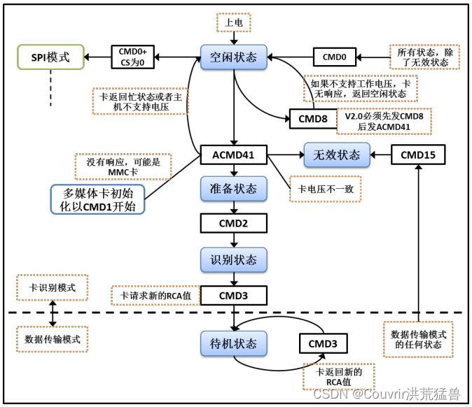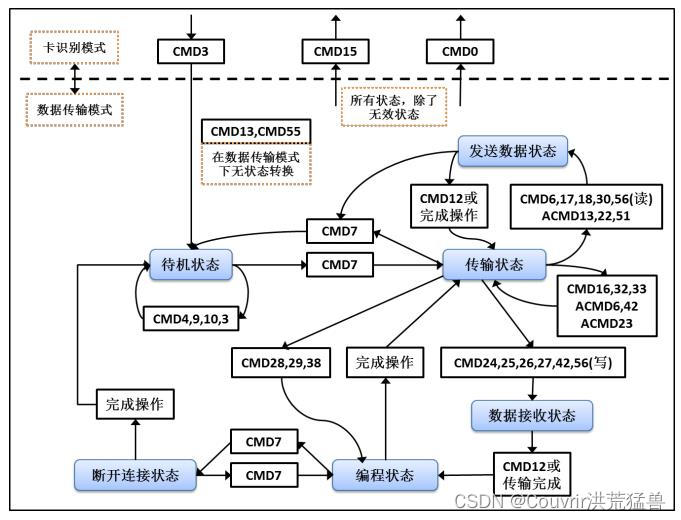 空闲状态:主机上电后,所有卡处于空闲状态(包括当前处于无效状态的卡)。主机也可以发送 CMD0 让所有卡软复位从而进入空闲状态(但当前处于无效状态的卡并不会复位)。